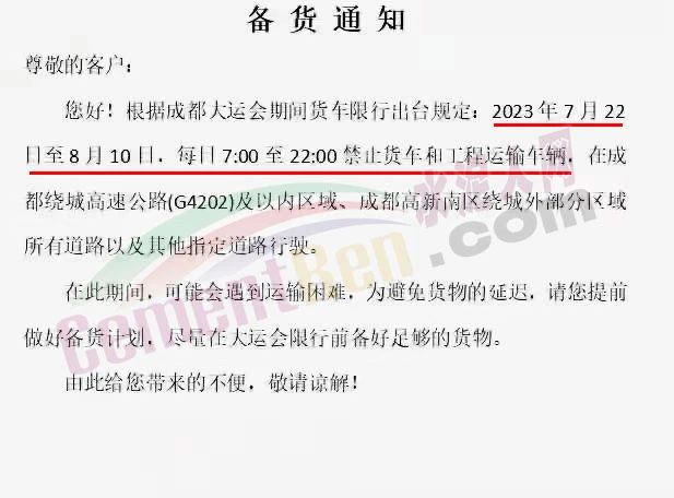 同期,四川成都及周邊地區(qū)企業(yè)接到備貨通知稱,根據(jù)成都大運(yùn)會(huì)期間貨車限行出臺(tái)規(guī)定,2023年7月22日至8月10日,每日7時(shí)至22時(shí)禁止貨車和工程運(yùn)輸車輛,在成都繞城高速公路(G4202)及以內(nèi)區(qū)域、成都高新南區(qū)繞城外部分區(qū)域所有道路以及其他指定道路行駛。