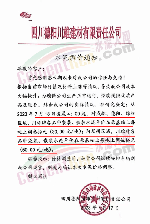 與此同時(shí),四川成都及周邊多個(gè)區(qū)域內(nèi)主要品牌水泥企業(yè)通知上調(diào)水泥價(jià)格30-50元/噸。