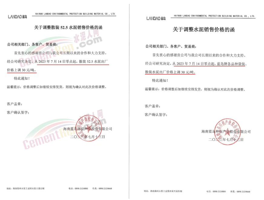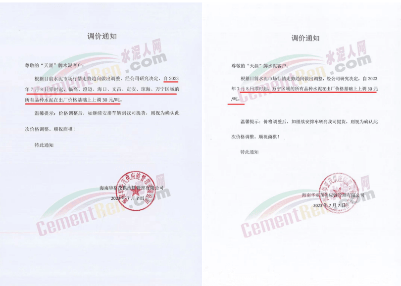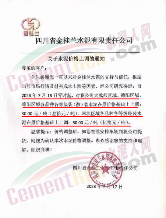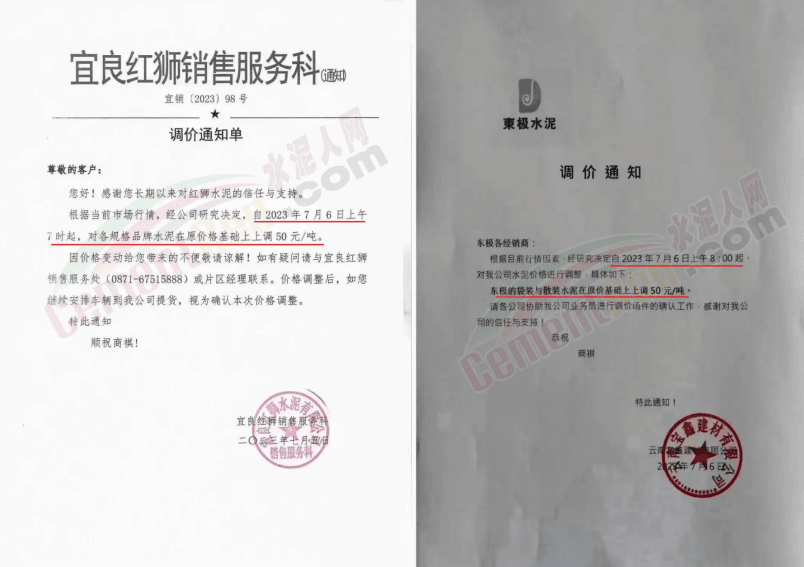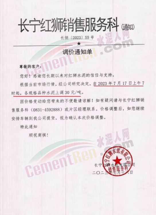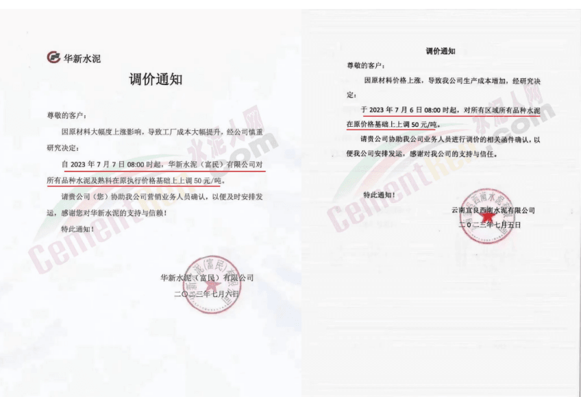華新水泥(劍川)有限公司通知結(jié)合市場(chǎng)情況,經(jīng)公司研究決定,特此通知價(jià)格調(diào)整。自2023年7月19日8時(shí)起,所有水泥品種統(tǒng)一上調(diào)30元/噸。