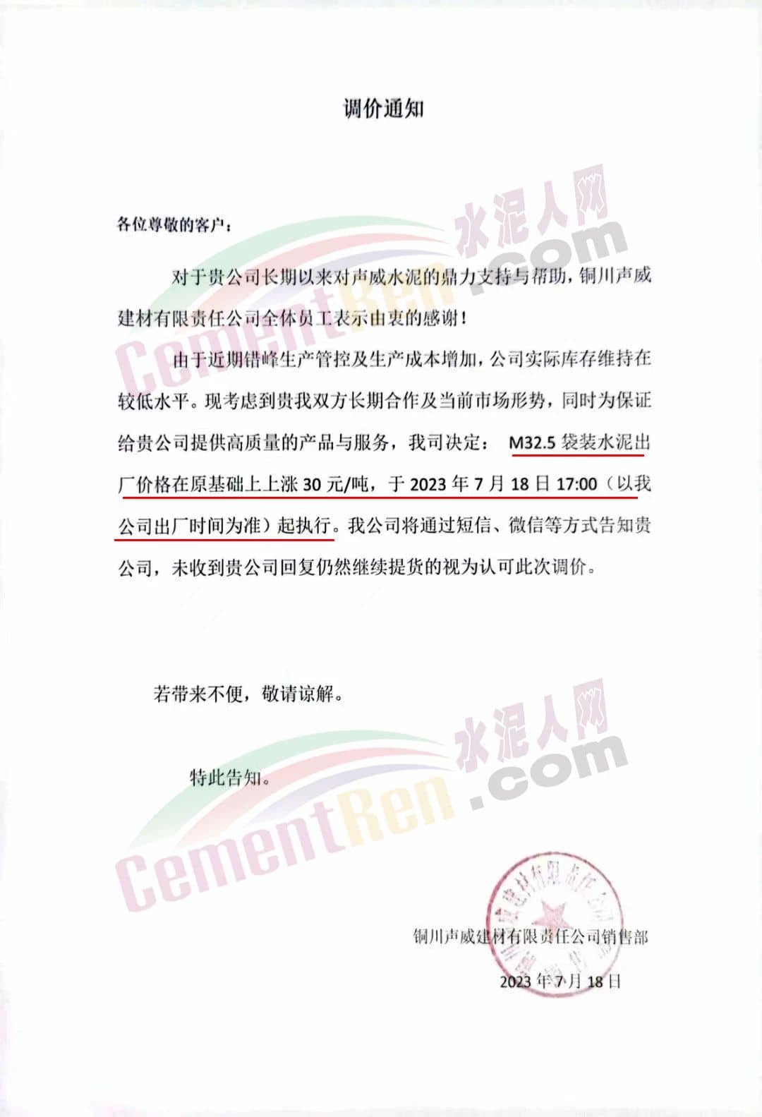 陜西富平水泥有限公司通知稱,為了響應(yīng)環(huán)保錯(cuò)峰生產(chǎn)政策,造成公司生產(chǎn)成本增加,為保證持續(xù)向客戶提供高品質(zhì)產(chǎn)品和服務(wù),經(jīng)公司研究決定,自2023年7月18日18時(shí)起,對(duì)M32.5袋裝水泥出廠價(jià)格在原價(jià)基礎(chǔ)上上調(diào)30元/噸。