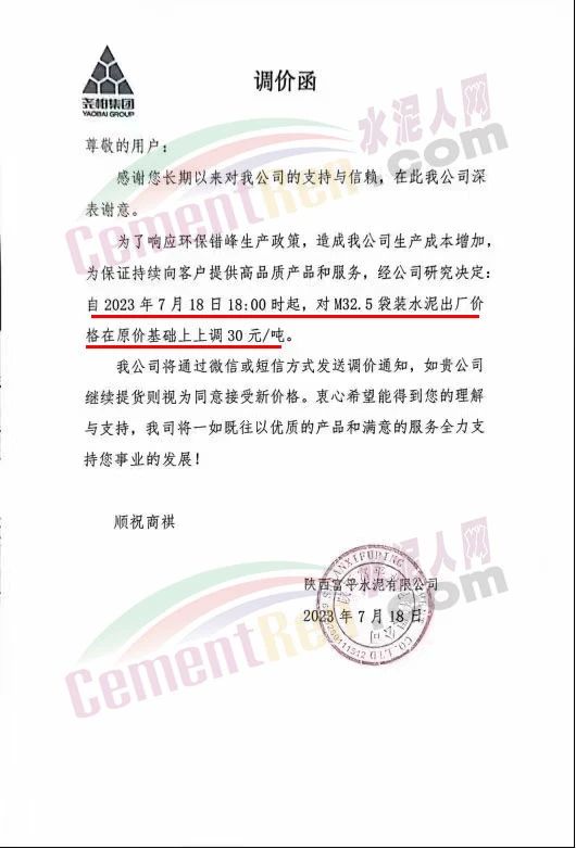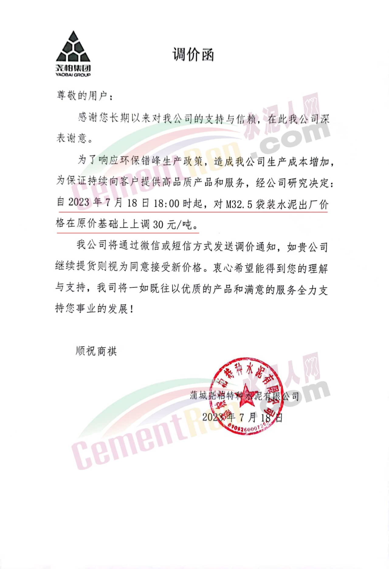 蒲城堯柏特種水泥有限公司通知,為了響應(yīng)環(huán)保錯(cuò)峰生產(chǎn)政策,造成公司生產(chǎn)成本增加。為保證持續(xù)向客戶提供高品質(zhì)產(chǎn)品和服務(wù),經(jīng)公司研究決定,自2023年7月18日18時(shí)起,對(duì)M32.5袋裝水泥出廠價(jià)格在原價(jià)基礎(chǔ)上上調(diào)30元/噸。
