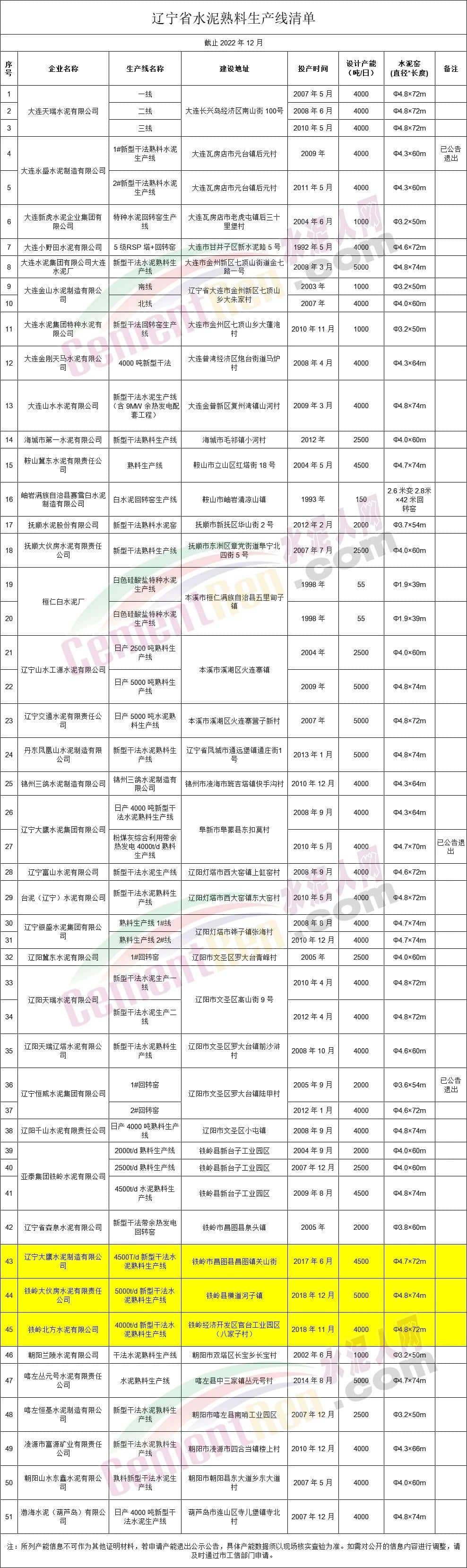 遼寧省水泥熟料生產(chǎn)線清單