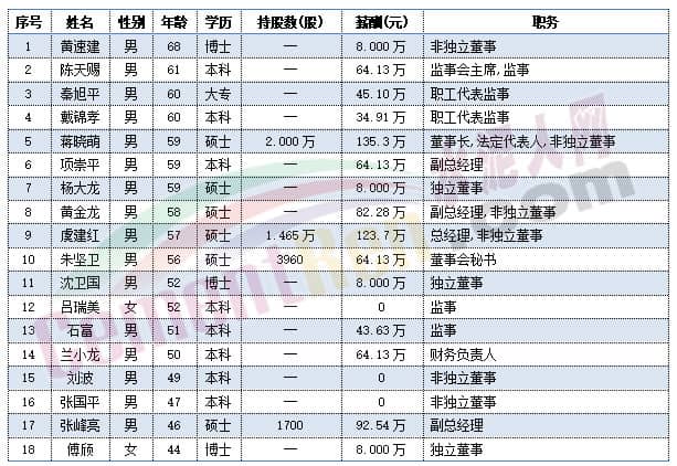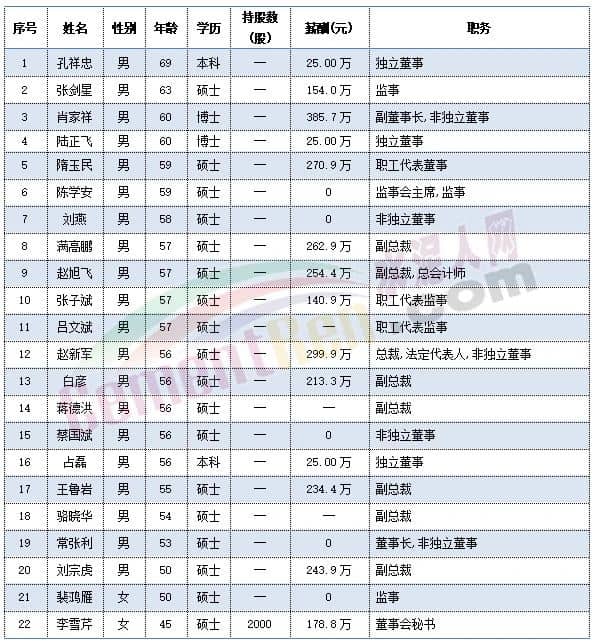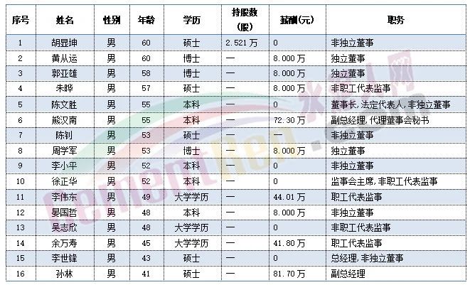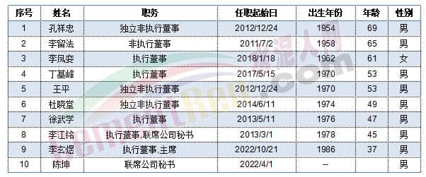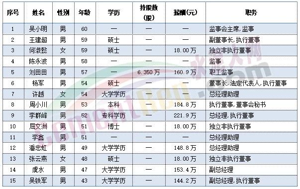 尖峰集團(tuán)職工代表秦旭平、戴錦孝今年60歲,董事長蔣曉萌、副總經(jīng)理項崇平、獨立董事楊大龍今年59歲,副總經(jīng)理黃金龍今年58歲。