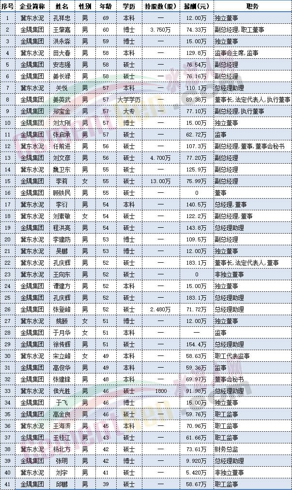 祁連山水泥總裁劉繼彬、海螺水泥副董事長王建超;華新水泥總裁李葉青;尖峰集團(tuán)董事長蔣曉萌、西部水泥總工程師王建禮;亞泰集團(tuán)董事翟懷宇在內(nèi)的18位上市公司高管為1964年生人,今年59歲。