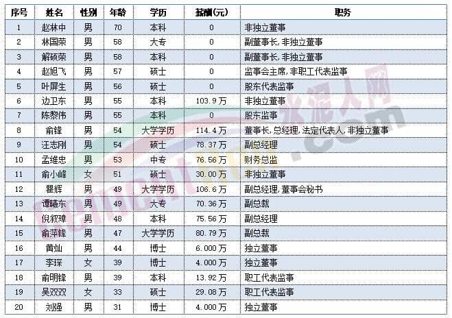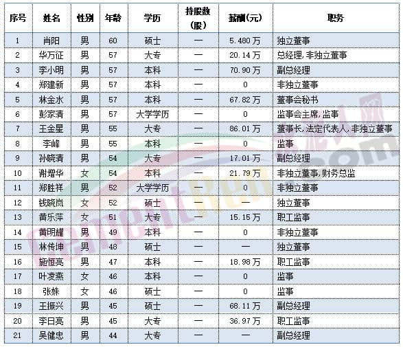 福建水泥獨立董事肖陽今年60歲,總經(jīng)理華萬征,副總經(jīng)理李小明,董事會秘書林金水以及監(jiān)事會主席彭家清今年都是57歲。