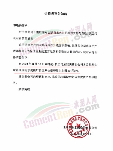 北京金隅水泥經(jīng)貿(mào)有限公司通知稱,由于錯峰生產(chǎn)以及環(huán)保管控升級因素影響,致使公司水泥生產(chǎn)成本提高。為保證企業(yè)的正常運營,自2023年8月18日8時公司各品種發(fā)往承德地區(qū)的水泥出廠價在原價格基礎上上調(diào)30元/噸。