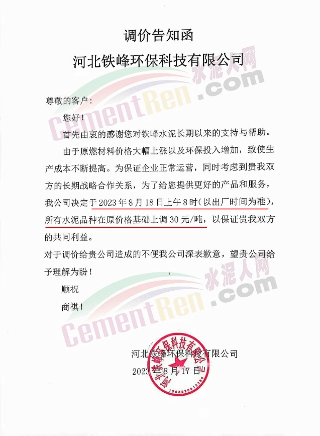 河北鐵峰環(huán)保科技有限公司通知稱,由于原燃材料價格大幅上漲以及環(huán)保投入增加,致使生產(chǎn)成本不斷提高。為保證企業(yè)正常運營,決定于2023年8月18日上午8時,所有水泥品種在原價格基礎上調(diào)30元/噸。