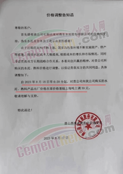 唐山燕東水泥有限公司通知稱,由于近期原材料不斷上漲,國家為改善環(huán)境不斷實施限產(chǎn)、停產(chǎn)等措施。致使水泥成本大幅提高,根據(jù)成本的增長和市場情況,自2023年8月18日早6:30分起,對水泥、熟料產(chǎn)品出廠價格在原價格基礎上每噸上調(diào)30元。