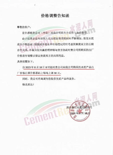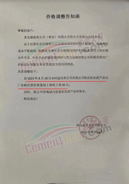唐山圣龍水泥有限公司通知稱,由于近期企業(yè)環(huán)保投入以及煤炭等原燃材料不斷增加,致使水泥成本不斷提高。根據(jù)成本增長和市場情況,自2023年8月18日8時起,水泥出廠價格在原價格基礎上每噸上調(diào)30元。