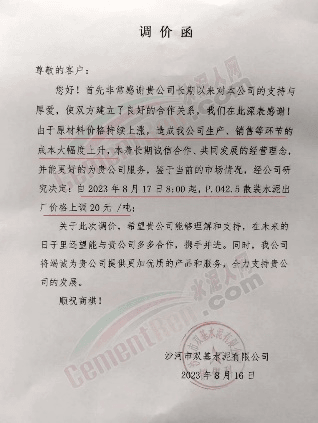 沙河市雙基水泥有限公司通知,由于原材料價格持續(xù)上漲,造成公司生產(chǎn)、銷售等環(huán)節(jié)的成本大幅度上升,本著長期誠信合作、共同發(fā)展的經(jīng)營理念并能更好的為貴公司服務,鑒于當前的市場情況,經(jīng)公司研究決定,自2023年8月17日8時起,P.O42.5散裝水泥出廠價格上調(diào)20元/噸。