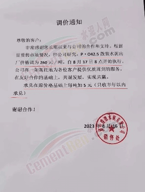 天津市金晟華水泥股份有限公司通知稱,由于市場變化等因素,經(jīng)公司研究決定自2023年8月17日20:00時起,對PO42.5級水泥出廠價上調(diào)30元/噸。