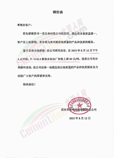 武安市新峰水泥有限責任公司通知稱,自2023年8月12日下午3點開始,P.O42.5散裝水泥出廠價格上調(diào)30元/噸。
