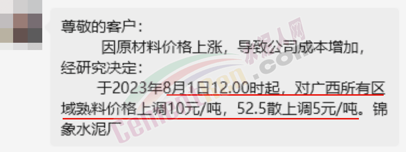 廣西錦象水泥通知,因原材料價格上漲,導致成本增加,自8月1日12:00時起,對廣西所有區(qū)域熟料價格上調(diào)10元/噸,52.5散裝水泥價格上調(diào)5元/噸。