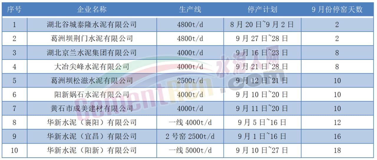 湖北22家水泥企業(yè)23條熟料線三季度停產(chǎn),9月份最長(zhǎng)停窯18天