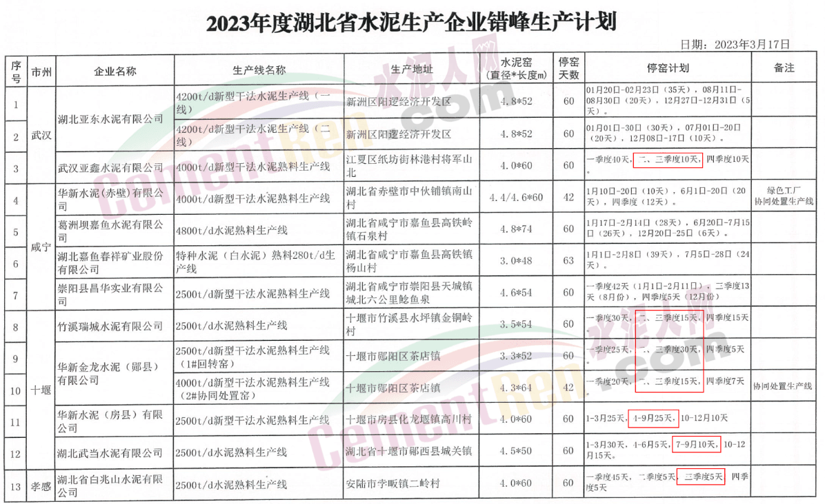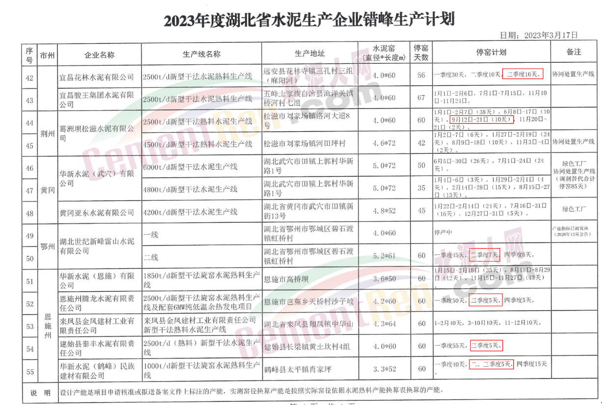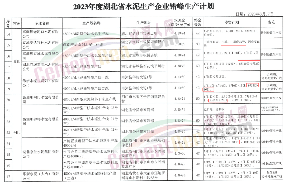 湖北省水泥生產(chǎn)企業(yè)2023年度錯(cuò)峰生產(chǎn)計(jì)劃顯示,22家水泥企業(yè)23條熟料線三季度將涉及停窯限產(chǎn)。其中明確于9月份停窯限產(chǎn)的10家企業(yè)停窯時(shí)間從2天至18天不等。