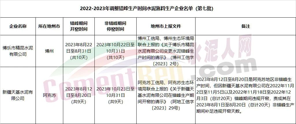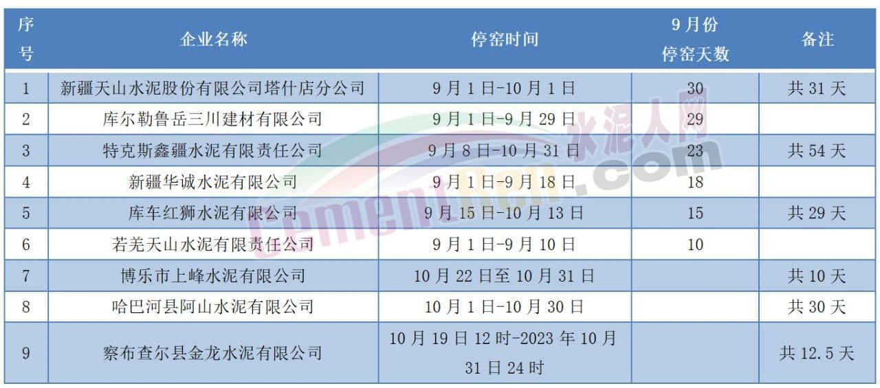 按照新疆工信廳年內(nèi)發(fā)布的七批水泥企業(yè)調(diào)整錯(cuò)峰生產(chǎn)時(shí)間的公告,明確于9月內(nèi)停窯的6家企業(yè)停窯時(shí)間從10天~30天不等。明確9-10月份內(nèi)停窯的10家企業(yè),最長(zhǎng)停窯54天。