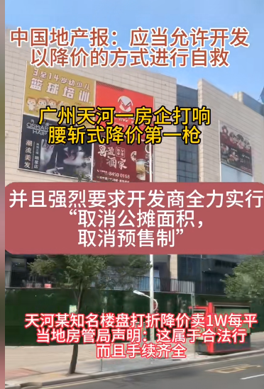 日前,廣州天河一知名樓盤打折降價(jià)賣1W每平,打響“腰斬式”降價(jià)第一槍。并且強(qiáng)烈要求開(kāi)發(fā)商全力實(shí)行取消公攤面積,取消預(yù)售制。當(dāng)?shù)胤抗芫致暶鞣Q,這屬于合法行為,手續(xù)齊全。