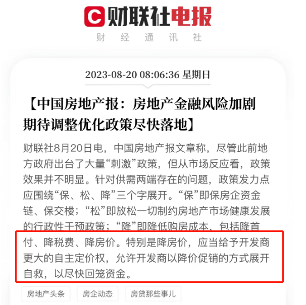 代表官方的中國(guó)房地產(chǎn)報(bào)發(fā)文稱:房地產(chǎn)金融風(fēng)險(xiǎn)加劇期待調(diào)整優(yōu)化政策盡快落地。其中提到最重要的一點(diǎn),應(yīng)當(dāng)給予開(kāi)發(fā)商更大的自主定價(jià)權(quán),允許開(kāi)發(fā)商以降價(jià)促銷的方式展開(kāi)自救,以盡快回籠資金。
