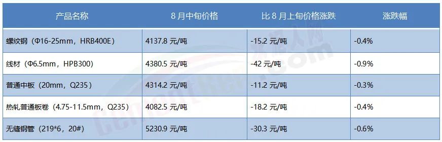 國(guó)家統(tǒng)計(jì)局24日公布的數(shù)據(jù)顯示,全國(guó)流通領(lǐng)域9大類50種重要生產(chǎn)資料市場(chǎng)價(jià)格,2022年8月中旬與8月上旬相比,23種產(chǎn)品價(jià)格上漲,22種下降,5種持平。水泥人網(wǎng)注意到與水泥相關(guān)的鋼鐵、煤炭等都在下跌。