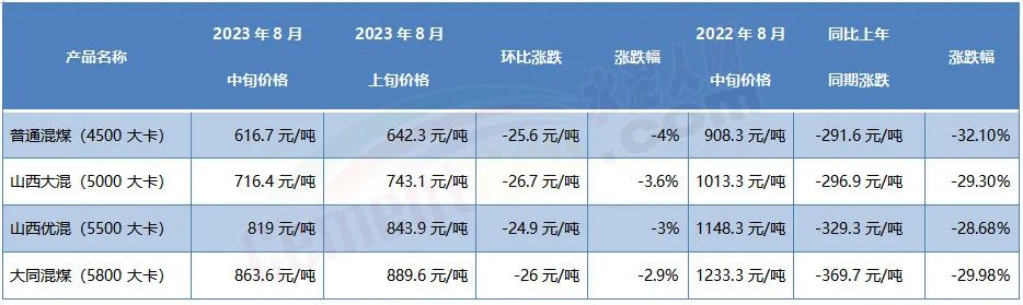 煤價(jià)方面,8月中旬各熱值煤炭?jī)r(jià)格同比上年同期,出現(xiàn)了近三成的下跌,全部跌至900元/噸以下。