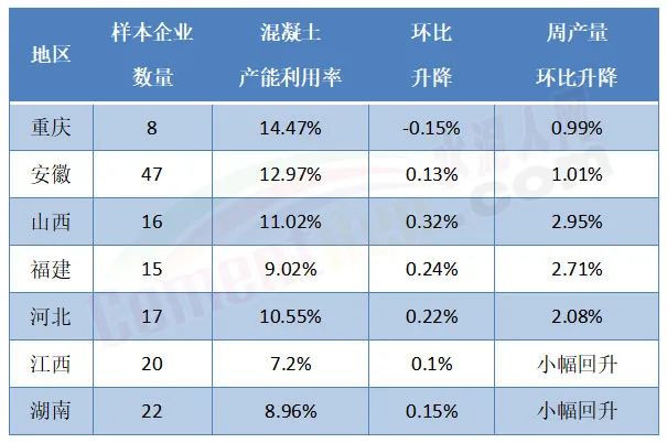 其中,安徽、山西、河北近期天氣利好施工,攪拌站恢復(fù)正常供應(yīng),混凝土發(fā)運(yùn)量出現(xiàn)小幅回升;重慶新開(kāi)工項(xiàng)目較少,需求不佳,混凝土發(fā)運(yùn)量有所降低;福建市場(chǎng)新增較少,多數(shù)已在手訂單項(xiàng)目有所開(kāi)工,因此帶來(lái)些許新增需求,短期來(lái)看,項(xiàng)目工程進(jìn)度受到資金困擾較大。