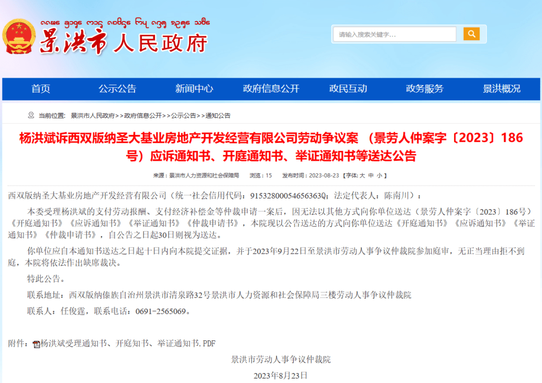 近日,景洪市人民政府發(fā)布公告,因楊洪斌的支付勞動(dòng)報(bào)酬、支付經(jīng)濟(jì)補(bǔ)償金等仲裁申請(qǐng)一案無法以其他方式向西雙版納圣大基業(yè)房地產(chǎn)開發(fā)經(jīng)營有限公司送達(dá)《開庭通知書》《應(yīng)訴通知書》《舉證通知書》《仲裁申請(qǐng)書》,景洪市勞動(dòng)人事爭(zhēng)議仲裁院現(xiàn)以公告送達(dá)的方式該企業(yè)送達(dá)?! ?br />