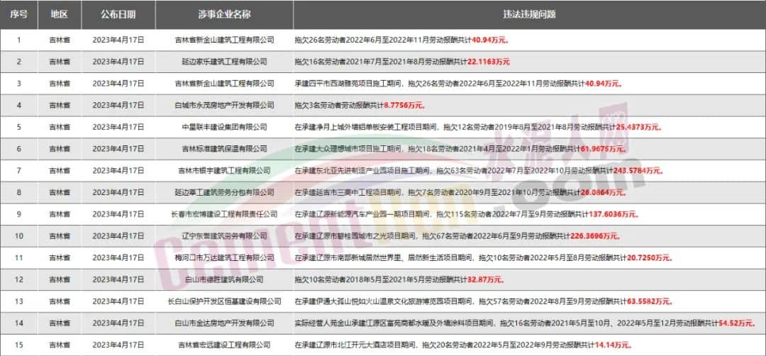 吉林省15家房企、建企欠薪被通報(bào)或處罰,涉及金額775.96萬元