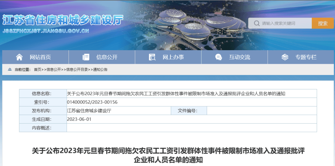 6月1日,江蘇省住房和城鄉(xiāng)建設(shè)廳公開消息,對(duì)2023年元旦春節(jié)期間因拖欠農(nóng)民工工資引發(fā)群體性事件的126家企業(yè)予以全省范圍內(nèi)限制建筑市場(chǎng)準(zhǔn)入,對(duì)44家企業(yè)予以全省通報(bào)批評(píng)。