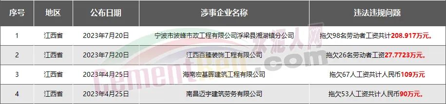 江西省4家房企、建企欠薪被通報(bào)或處罰,涉及金額435.68萬元