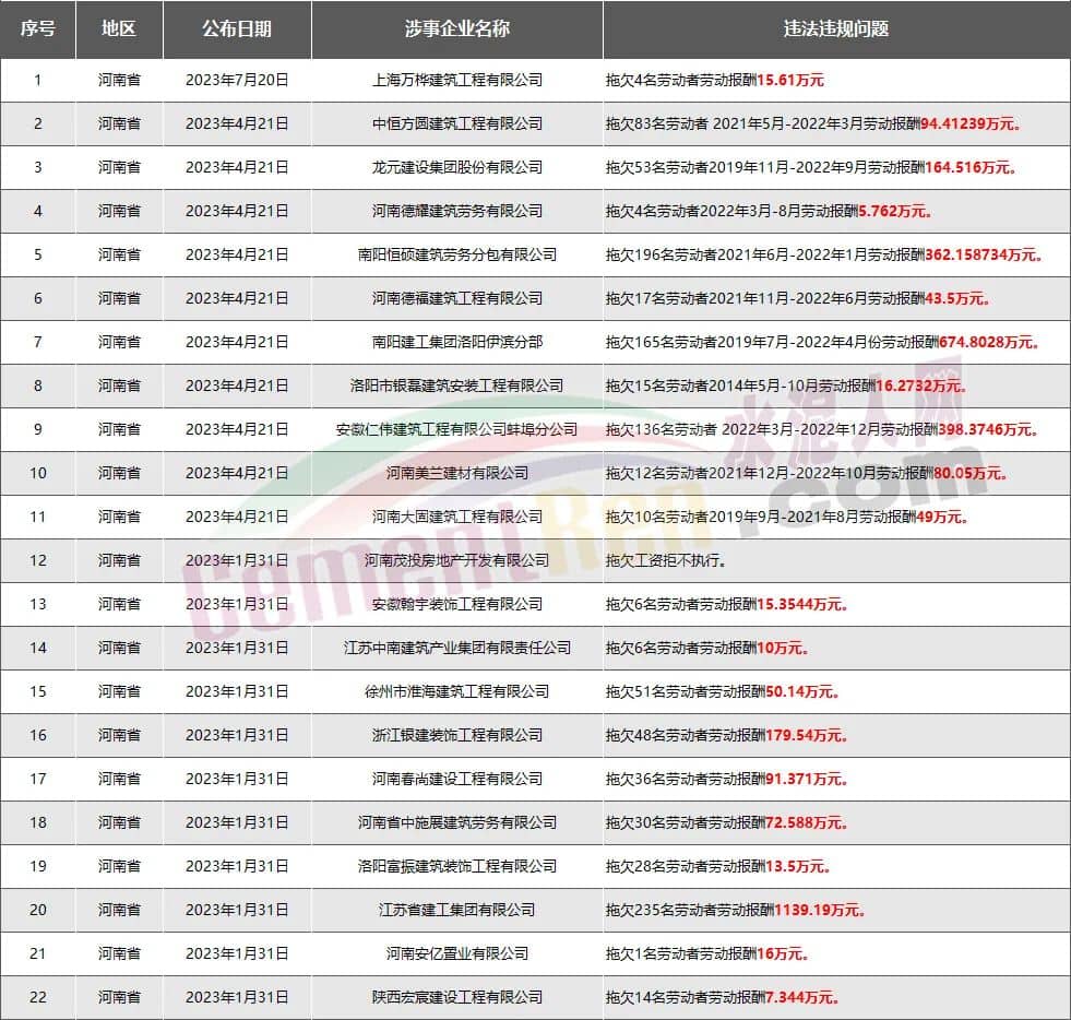 河南省22家房企、建企欠薪被通報(bào)或處罰,涉及金額3499.43萬元