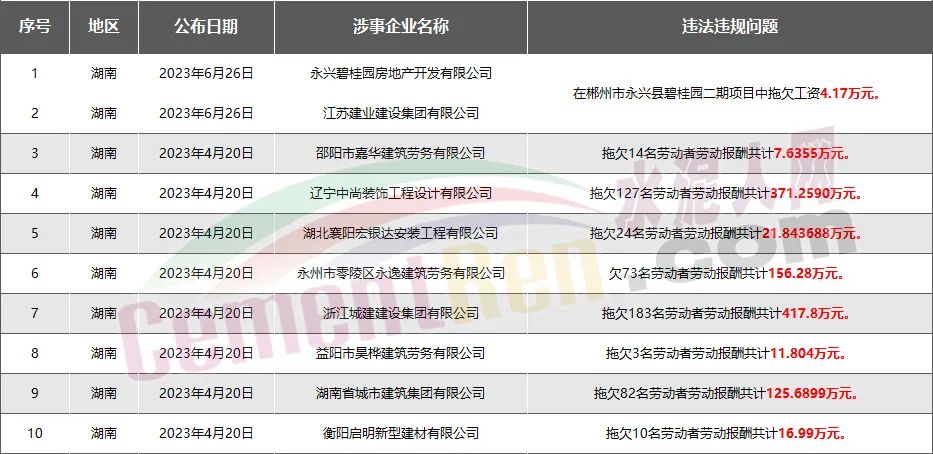 湖南省10家房企、建企欠薪被通報(bào)或處罰,涉及金額1133.44萬元