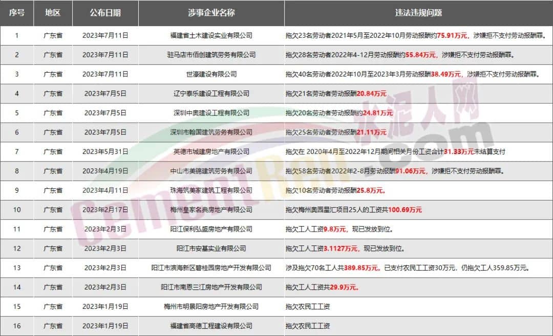 廣東省16家房企、建企欠薪被通報(bào)或處罰,涉及金額918.51萬元