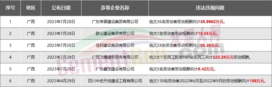 廣西6家房企、建企欠薪被通報(bào)或處罰,涉及金額564.52萬元