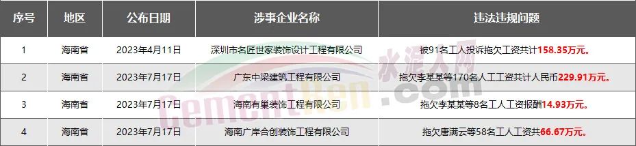 海南省4家房企、建企欠薪被通報(bào)或處罰,涉及金額469.86萬元