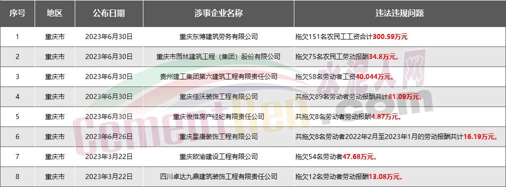 重慶市8家房企、建企欠薪被通報(bào)或處罰,涉及金額538.34萬元