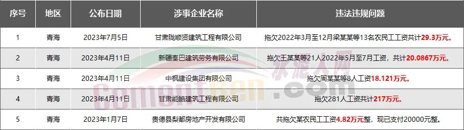 青海省5家房企、建企欠薪被通報(bào)或處罰,涉及金額289.32萬元