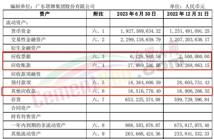 但塔牌集團(tuán)在業(yè)績(jī)大比例上升的同時(shí),應(yīng)收票據(jù)增幅也超預(yù)期。塔牌集團(tuán)2023年半年度財(cái)務(wù)報(bào)告中數(shù)據(jù)顯示,應(yīng)收票據(jù)及應(yīng)收賬款3412萬元,同比增長(zhǎng)33.18%,其中應(yīng)收票據(jù)612.7萬元,同比增長(zhǎng)6026.94%,應(yīng)收賬款2799萬元,同比增長(zhǎng)9.69%。