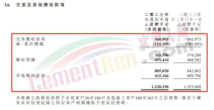 2023年上半年亞洲水泥應(yīng)收賬款5.6億,應(yīng)收票據(jù)8.05億,其他應(yīng)收款12.2億。