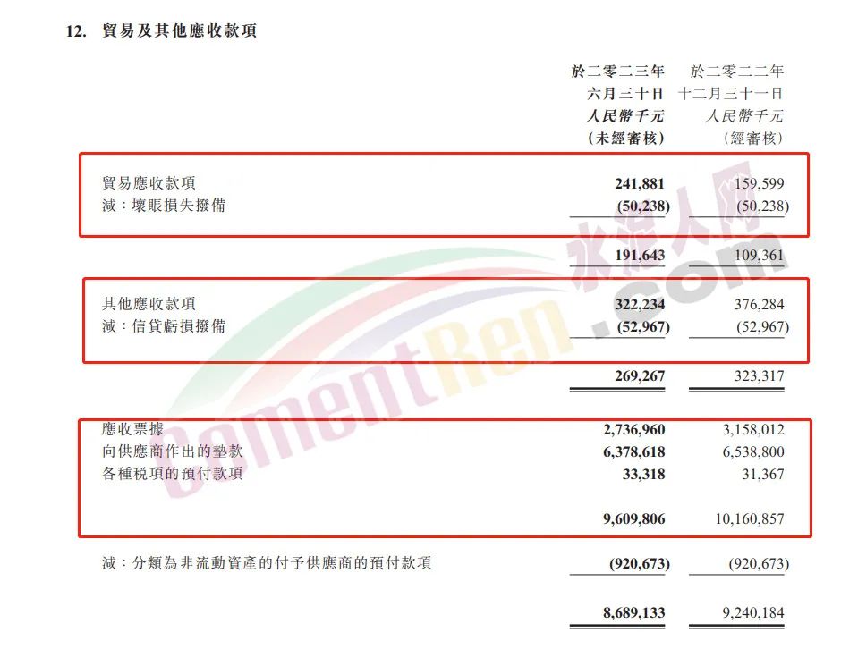 2023年上半年天瑞水泥應(yīng)收賬款2.42億,應(yīng)收票據(jù)96.1億,其他應(yīng)收款3.22億。