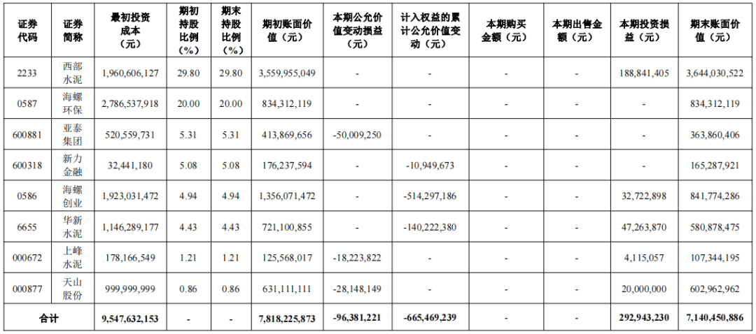 作為水泥行業(yè)的“股神”,海螺水泥在上半年繼續(xù)持有同行西部水泥、亞泰集團(tuán)、華新水泥、上峰水泥、天山股份等企業(yè)的股份。截至2023年6月末,海螺水泥持有其他上市公司股份情況如下: