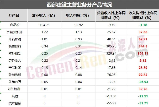 今年上半年,西部建設(shè)仍以預(yù)拌混凝土生產(chǎn)為核心,輻射水泥、外加劑、商品砂漿、砂石骨料、物流運(yùn)輸、技術(shù)研發(fā)與服務(wù)、檢測(cè)、資源綜合利用、電子商務(wù)等業(yè)務(wù),基本建立了“技術(shù)研發(fā)+資源儲(chǔ)備+生產(chǎn)+銷售+服務(wù)”的產(chǎn)業(yè)鏈條。同時(shí),外銷外加劑、外銷水泥、銷售材料、對(duì)外租賃等業(yè)務(wù)板塊營業(yè)收入及收入構(gòu)成同比去年均有所增長。