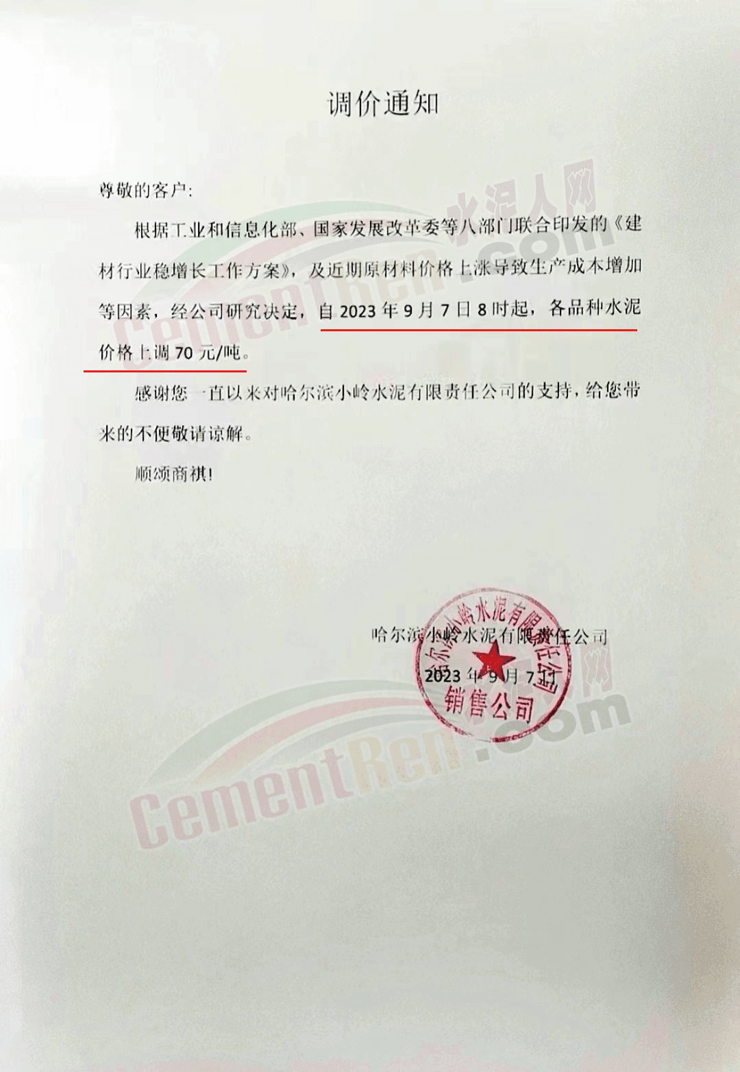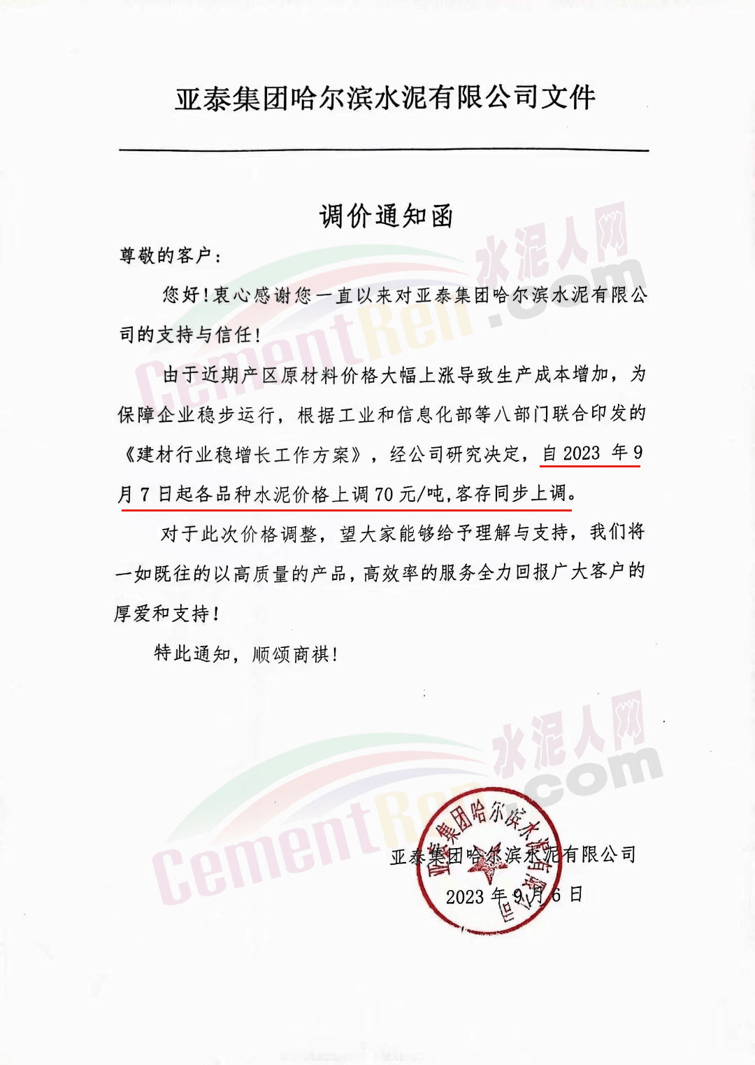 日前,亞泰集團哈爾濱水泥有限公司通知,由于近期產(chǎn)區(qū)原材料價格大幅上漲導致生產(chǎn)成本增加,為保障企業(yè)穩(wěn)步運行,根據(jù)工業(yè)和信息化部等八部門聯(lián)合印發(fā)的《建材行業(yè)穩(wěn)增長工作方案》,經(jīng)公司研究決定,自2023年9月7日起各品種水泥價格上調(diào)70元/噸,客存同步上調(diào)。