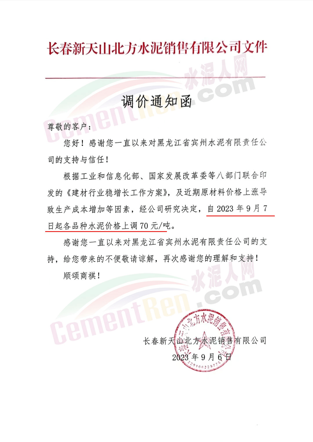 長春新天山北方水泥銷售有限公司通知,根據(jù)工業(yè)和信息化部、國家發(fā)展改革委等八部門聯(lián)合印發(fā)的《建材行業(yè)穩(wěn)增長工作方案》,及近期原材料價格上漲導致生產(chǎn)成本增加等因素,經(jīng)公司研究決定,自2023年9月7日起各品種水泥價格上調(diào)70元/噸。