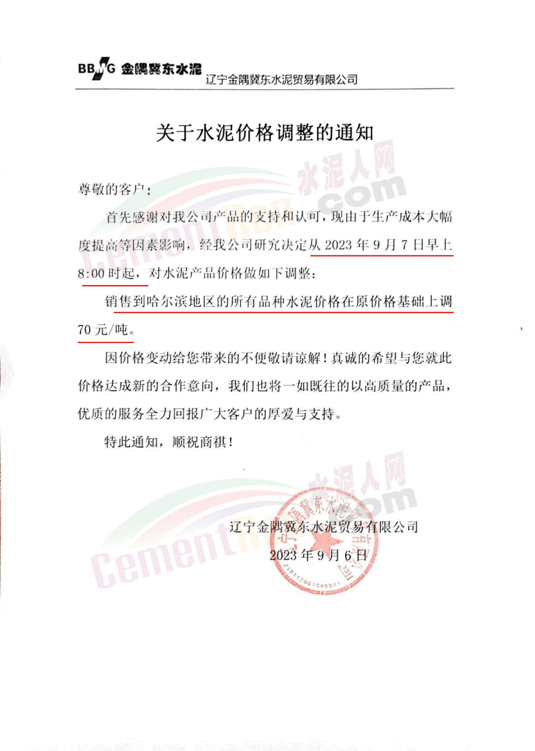 遼寧金隅冀東水泥貿(mào)易有限公司通知,由于生產(chǎn)成本大幅度提高等因素影響,經(jīng)公司研究決定從2023年9月7日早上8時起,對銷售到哈爾濱地區(qū)的所有品種水泥價格在原價格基礎上上調(diào)70元/噸。