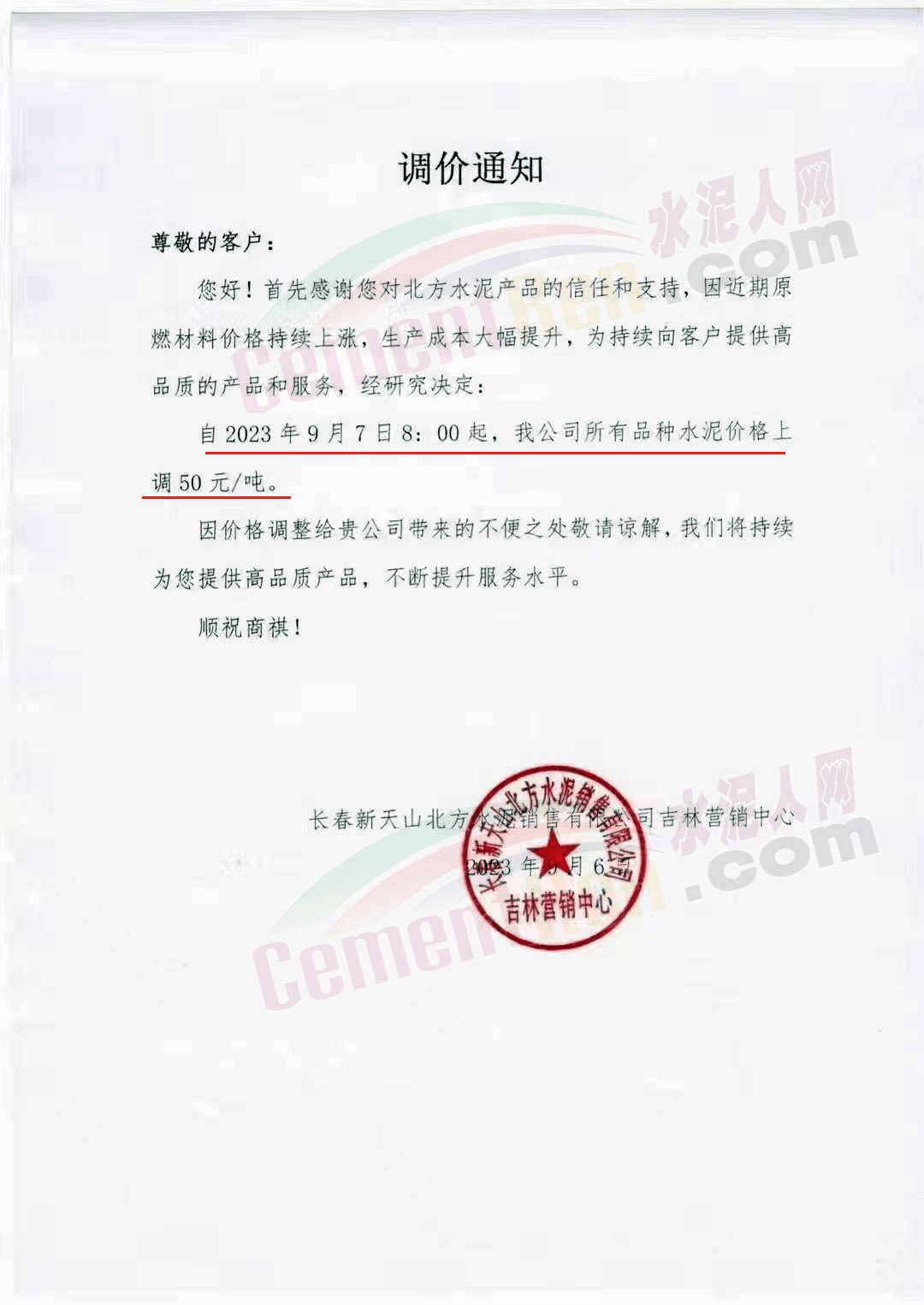 長春新天山北方水泥銷售有限公司吉林營銷中心通知,因近期原燃材料價格持續(xù)上漲,生產(chǎn)成本大幅提升,為持續(xù)向客戶提供高品質(zhì)的產(chǎn)品和服務,經(jīng)研究決定:自2023年9月7日8時起,公司所有品種水泥價格上調(diào)50元/噸。