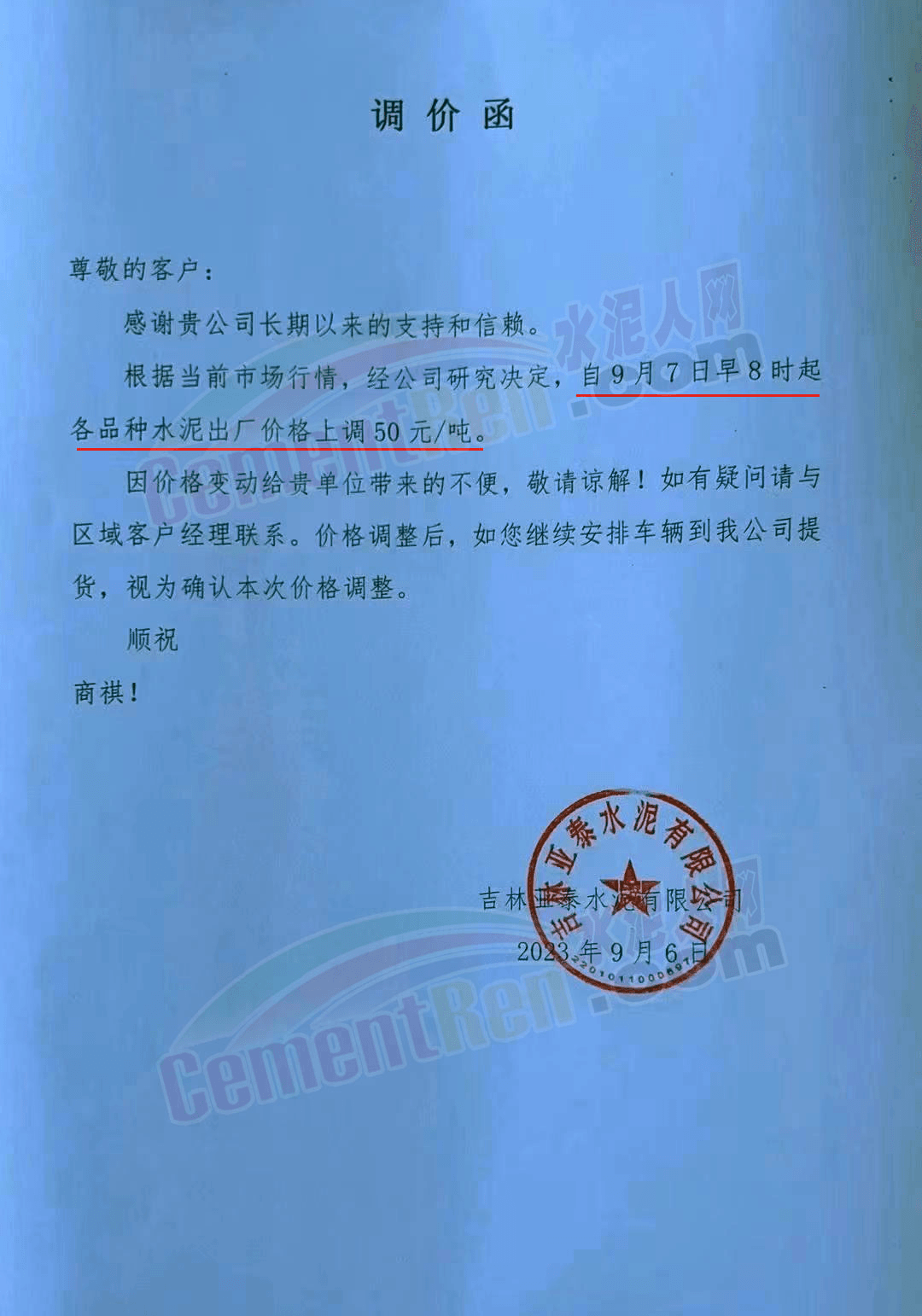 吉林亞泰水泥有限公司通知,根據(jù)當前市場行情,經(jīng)公司研究決定,自9月7日早8時起各品種水泥出廠價格上調(diào)50元/噸。