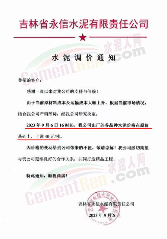吉林省永信水泥有限責任公司通知由于當前原材料成本及運輸成本大幅上升,根據(jù)當前市場情況,結合公司產(chǎn)銷形勢,經(jīng)研究決定:2023年9月6日16時起,公司出廠的各品種水泥價格在原價基礎上,上調(diào)40元/噸。
