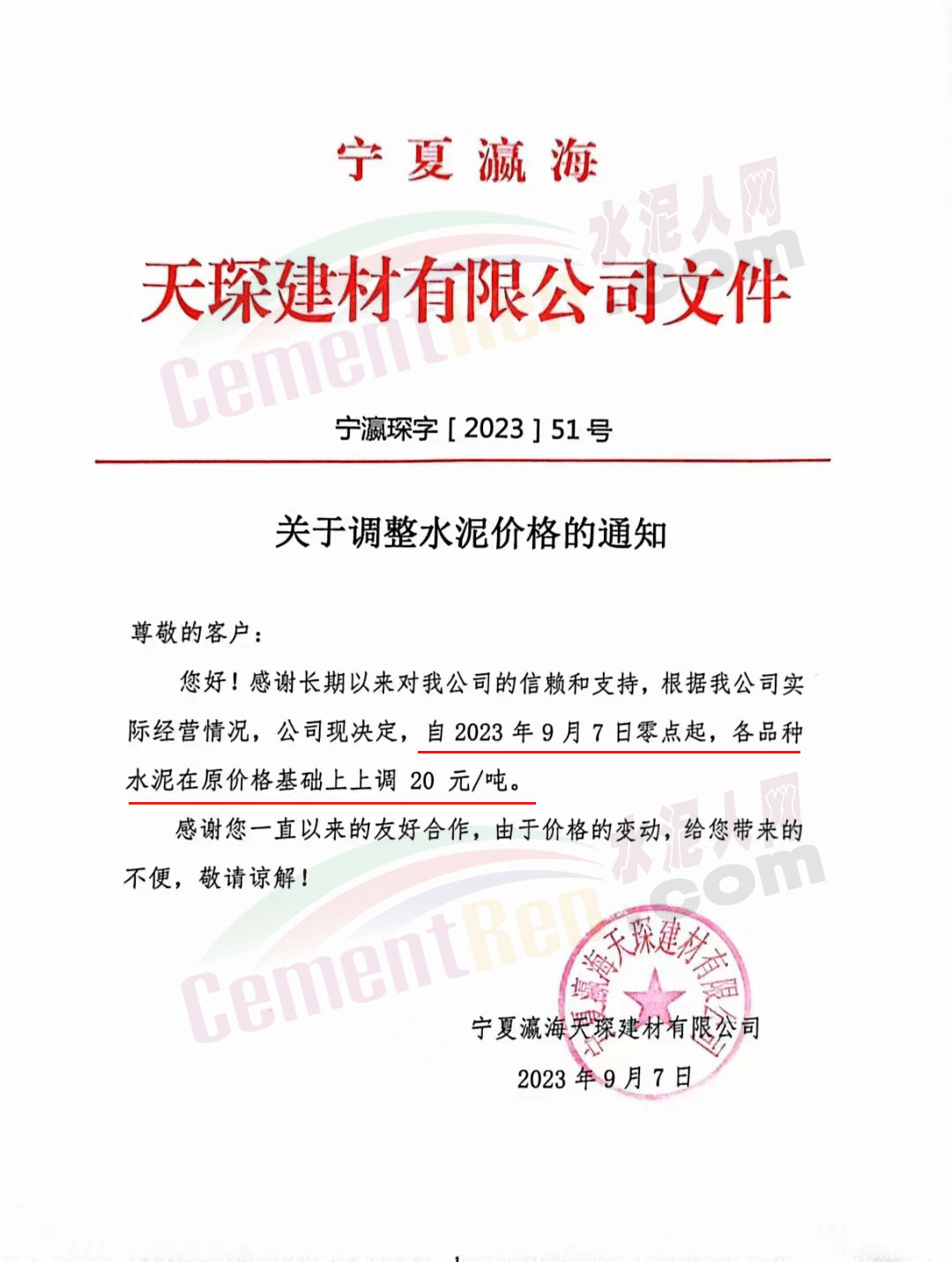 寧夏瀛海天琛建材有限公司通知,根據(jù)公司實際經(jīng)營情況,公司決定,自2023年9月7日零點起,各品種水泥在原價格基礎上上調(diào)20元/噸。