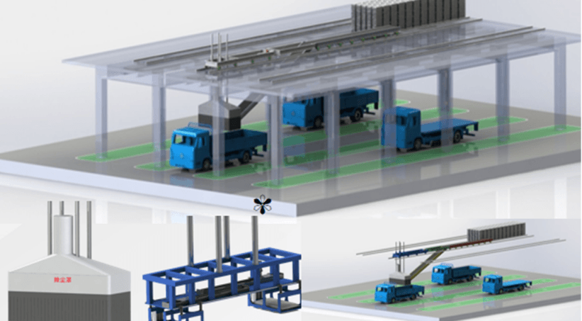 該系統(tǒng)涉及水泥行業(yè)中袋裝水泥智能裝車環(huán)節(jié),是適應(yīng)市場需要的新產(chǎn)品,水泥從包裝機(jī)后端的輸送帶運(yùn)出來,通過該系統(tǒng)自動裝車,全程不需人工介入。