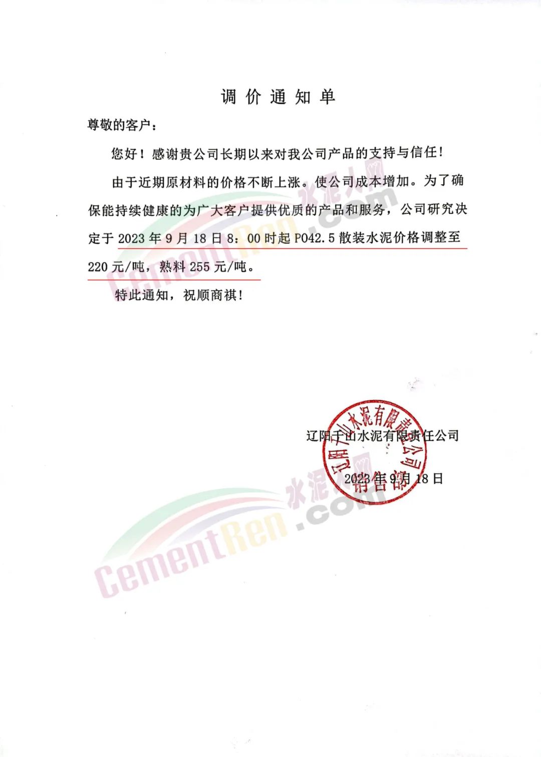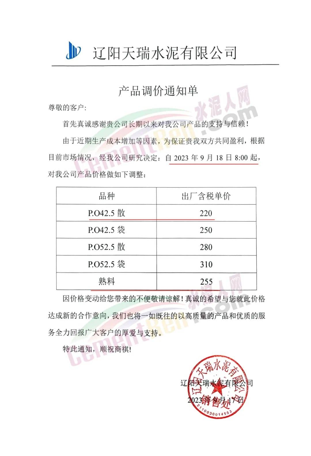 遼陽天瑞水泥有限公司通知,由于近期生產(chǎn)成本增加等因素,根據(jù)目前市場情況,經(jīng)公司研究決定:自2023年9月18日8:00起執(zhí)行新報價。其中P.O42.5散裝水泥出廠含稅報價220元/噸。熟料報價255元/噸。
